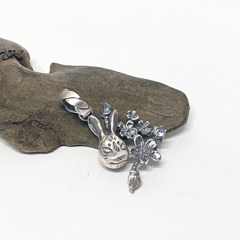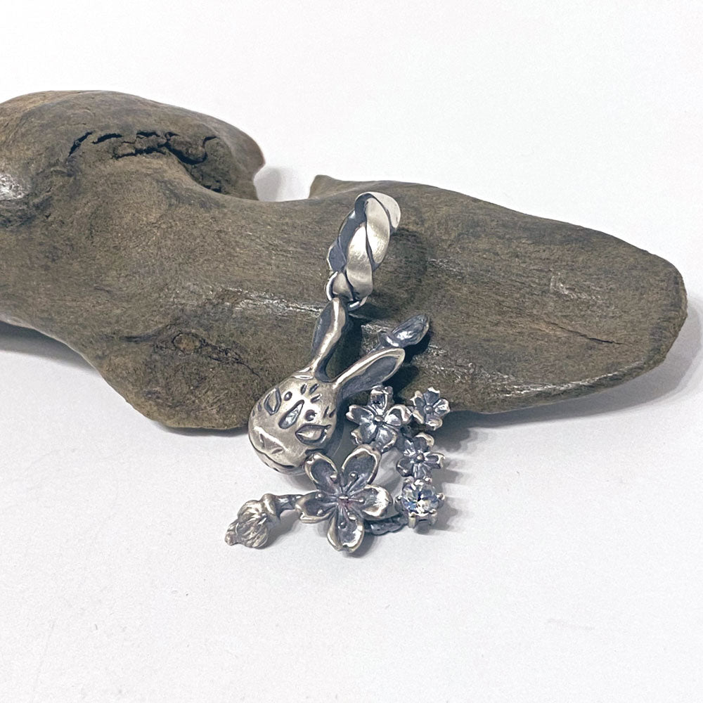 桜とともに兎面が舞う情景をモチーフにしたデザインのペンダントトップ。